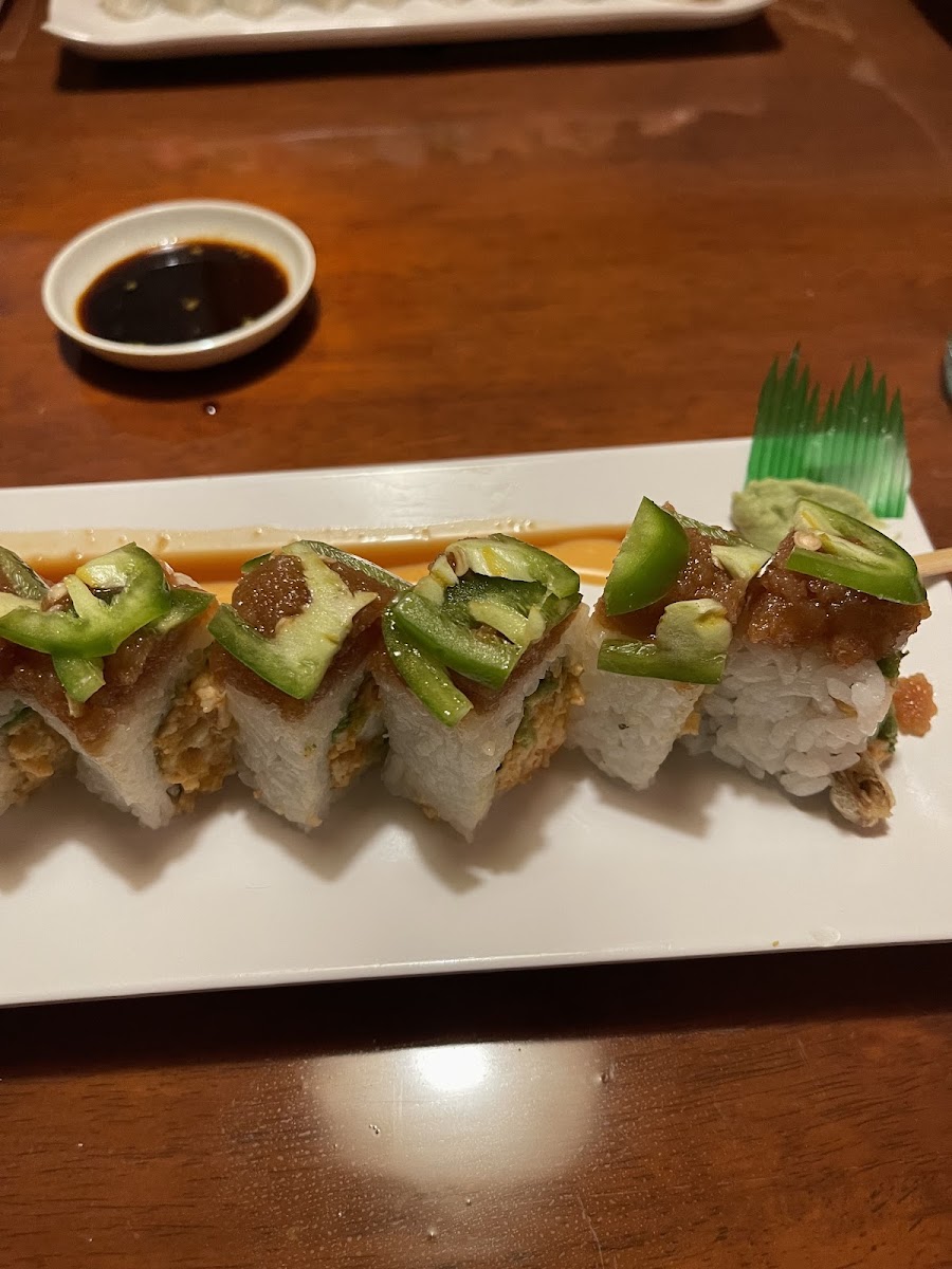 In: avocado, jalapeño, spicy tuna, cream cheese, special sauce