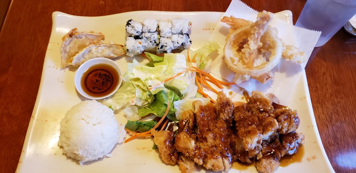 Chicken, eggroll, & gyoza. Served with salad & rice